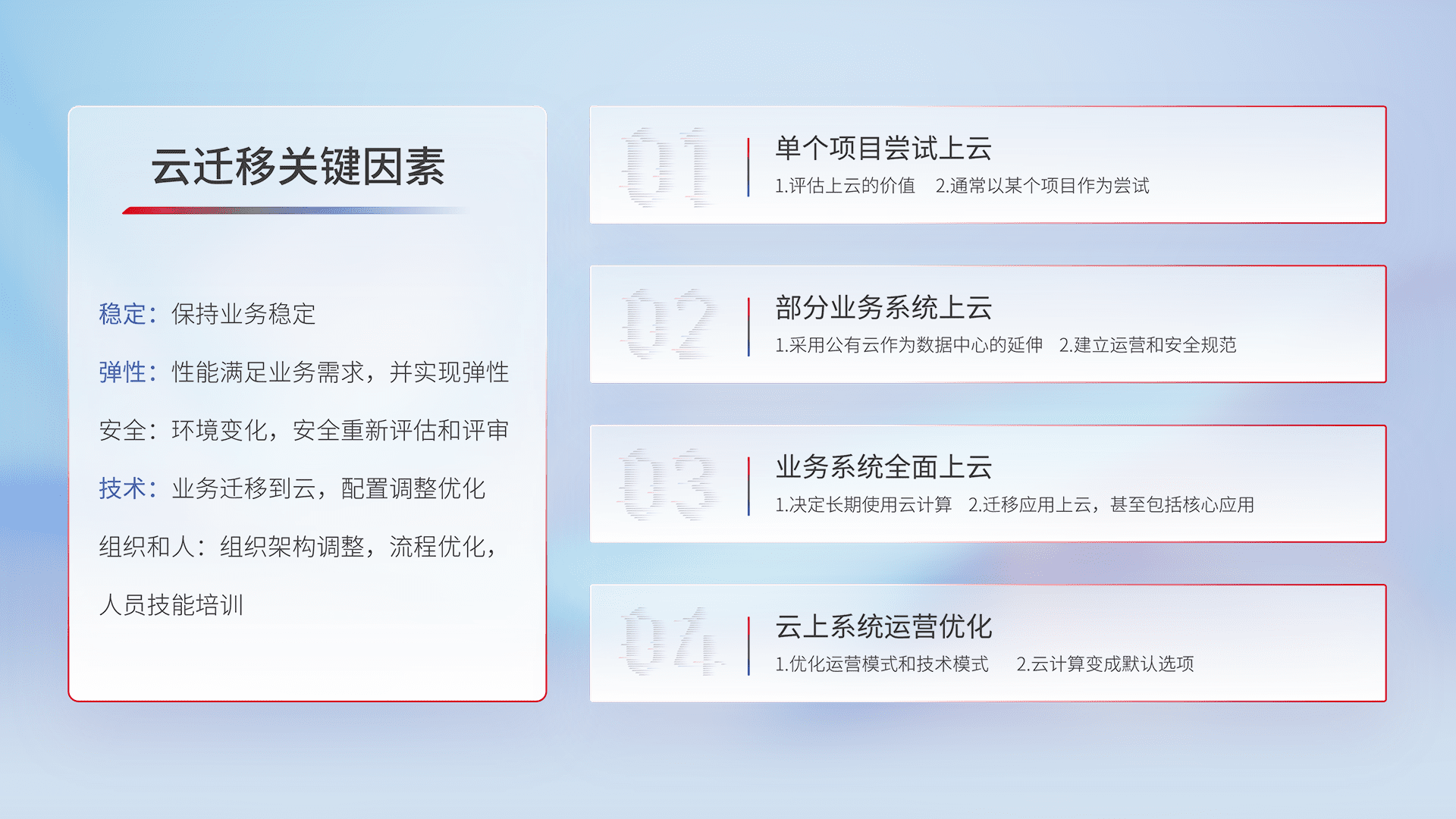 结合实际业务,,从规划设计、、、云平台选型、、云原生改造、、数据迁移、、、、集成交付,,,迁移全过程为客户识别最佳上云路径,,做好风险识别管理,,,设计网络架构、、身份权限、、安全审计合规、、、、操作审计、、日志审计、、、、监控告警策略、、、多站点容灾设计等,,,对云上基础设施进行整体规划,,提升IT治理水平,,,,以满足弹性、、高可用、、、、高性能的需求。。。