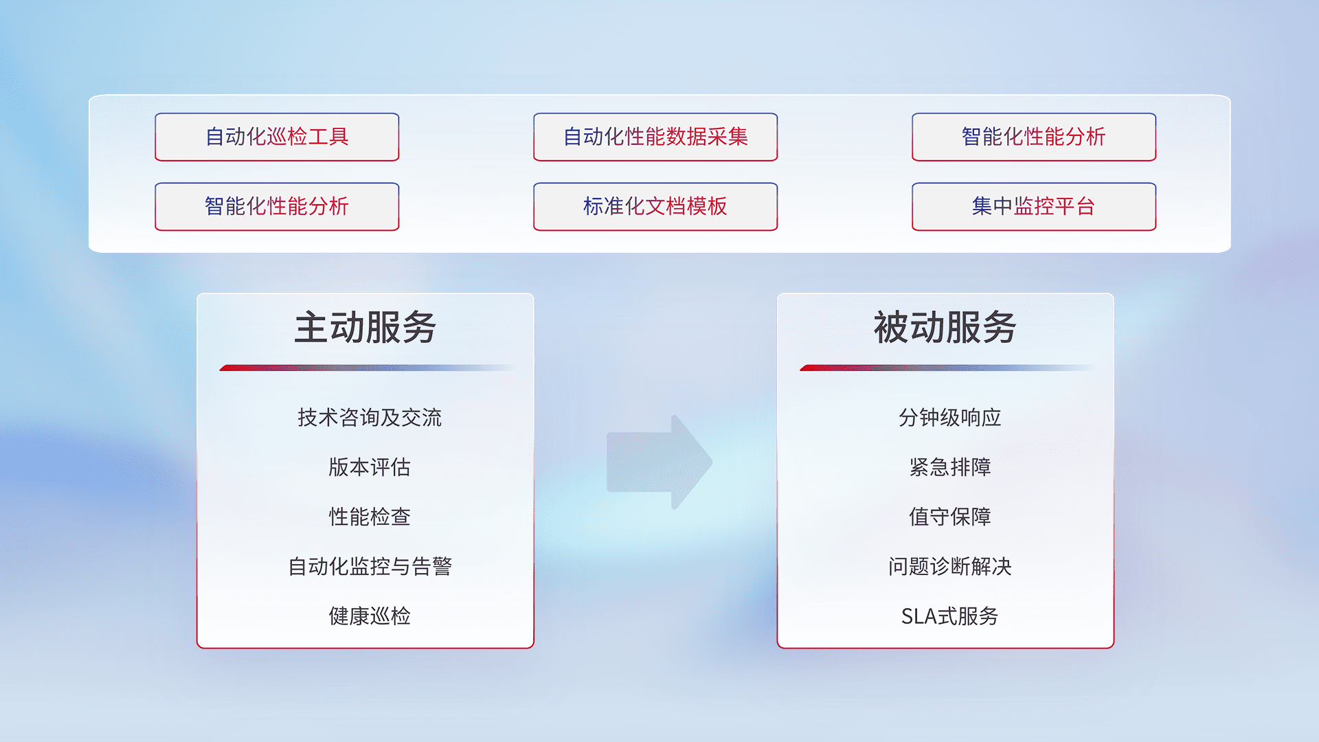 智能化工具和标准化文档,,保障服务质量,,,,提供主动服务(包含技术咨询、、、、版本评估、、、性能检查、、、、自动化监控与告警、、、健康巡检)和被动服务包含(分钟级响应、、、紧急排障、、值守保障、、问题诊断解决、、、SLA服务)。。